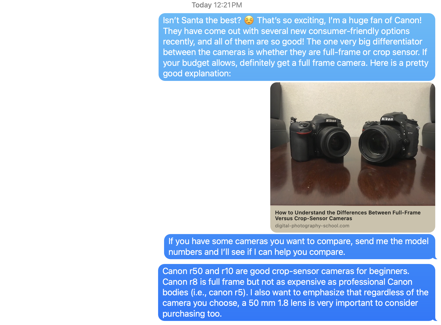 Photography gear recommendations in a text message to a student at Missy TImko Photography in Pittsburgh