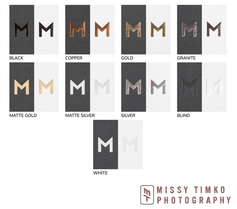 Notes: Blind debossing is the only option available for distressed leathers. 8" albums allow space for 15 characters per line. 12" albums allow space for 25 characters.